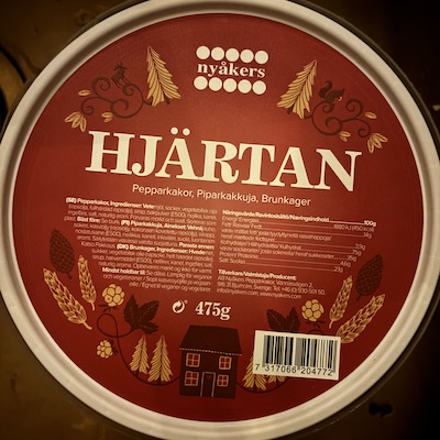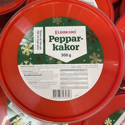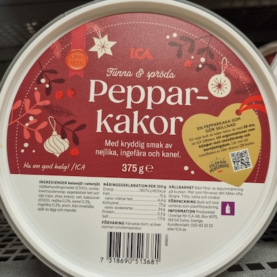 | Tillsatser Som tillsatser räknar vi de ingredienser som klassas som tillsatser av EU. Ju fler sådana produkten innehåller, desto lägre poäng.  | | 10  Tillsatser vägs in som 40% av totalen. | Industriella ingredienser Industriella ingredienser är sådant som inte klassas som tillsatser av EU, men som normalt inte används vid matlagning hemma. Ju fler sådana produkten innehåller, desto lägre poäng.  | | 10  Industriella ingredienser vägs in som 20% av totalen. | Aromer Aromämnen kan vara framställda på olika sätt och av olika råvaror. Om aromen inte specificeras alls har den fått en poäng, om den är naturlig utan angivande av ursprung har den fått fem poäng, om den är naturlig med angivande av ursprung har den fått nio poäng och produkter utan aromer har fått tio poäng. Produkterna har fått poäng efter den "sämsta" typen av arom som den innehåller.  | | 10  Aromer vägs in som 10% av totalen. | Ekologisk Ekologisk märkning: Ja (10 poäng) eller Nej (1 poäng).  | | 1  Ekologisk vägs in som 10% av totalen. | Ingredienser Samtliga ingredienser, enligt förpackningen.  | | Vetemjöl, sirap, SMÖR 12%, GRÄDDE, farinsocker, socker, ÄGG, kanel, jästmedel (natriumbikarbonat), ingefära, nejlika, kardemumma, salt. |