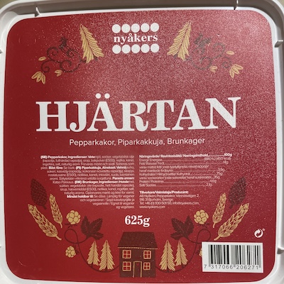 | Tillsatser Som tillsatser räknar vi de ingredienser som klassas som tillsatser av EU. Ju fler sådana produkten innehåller, desto lägre poäng.  | | 10  Tillsatser vägs in som 40% av totalen. | Industriella ingredienser Industriella ingredienser är sådant som inte klassas som tillsatser av EU, men som normalt inte används vid matlagning hemma. Ju fler sådana produkten innehåller, desto lägre poäng.  | | 10  Industriella ingredienser vägs in som 20% av totalen. | Aromer Aromämnen kan vara framställda på olika sätt och av olika råvaror. Om aromen inte specificeras alls har den fått en poäng, om den är naturlig utan angivande av ursprung har den fått fem poäng, om den är naturlig med angivande av ursprung har den fått nio poäng och produkter utan aromer har fått tio poäng. Produkterna har fått poäng efter den "sämsta" typen av arom som den innehåller.  | | 10  Aromer vägs in som 10% av totalen. | Ekologisk Ekologisk märkning: Ja (10 poäng) eller Nej (1 poäng).  | | 1  Ekologisk vägs in som 10% av totalen. | Ingredienser Samtliga ingredienser, enligt förpackningen.  | | Dinkelsikt, smör, grädde, gul sirap, kanel, ingefära, nejlika, bikarbonat, salt. Kristyr: Florsocker och äggvita. |